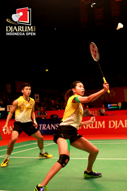 Tantowi Ahmad/Liliyana Natsir (Indonesia) gagal mengembalikan dropshoot yang dilepaskan Peng Soon Chan/Liu Ying Goh (Malaysia).