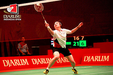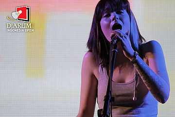 Penampilan salah satu vokalis band saat menghibur parapengunjung Djarum Indonesia Open Super Series 2013.