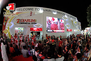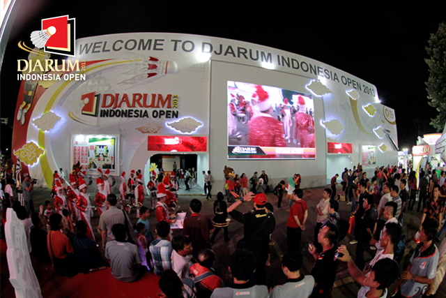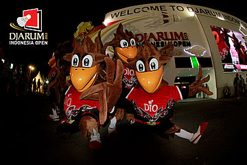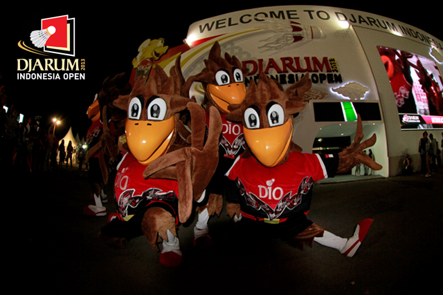 Maskot DIO menari di halaman Istora Senayan untuk menghibur para pengunjung Djarum Indonesia Open Super Series 2013 yang berdatangan.