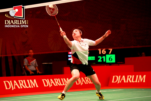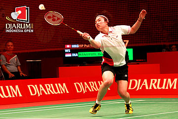 Yip Pui Yin (Hongkong) menyambar pengembalian tanggung dari Belaetrix Manupputy (Indonesia).