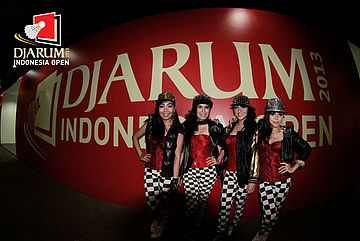 Para dancer berpose bersama usai tampil menghibur pengunjung Djarum Indonesia Open Super Series 2013.