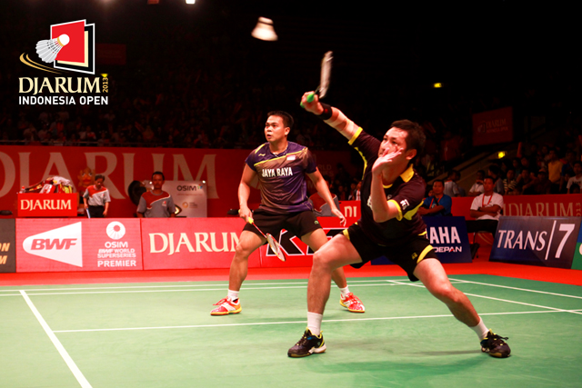 Alvent Yulianto Chandra/Markis Kido (Indonesia) bersiap mengembalikan shuttlecock ke arah Shin Baek Choel/Yoo Yeon Seong (Korea Selatan).