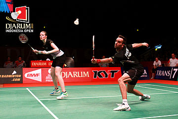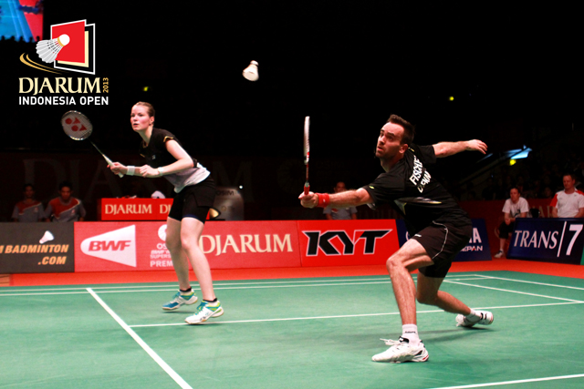 Joachim Fischer/Christinna Pedersen (Denmark) mengembalikan shuttlecock ke arah Tontowi Ahmad/Liliyana Natsir (Indonesia).