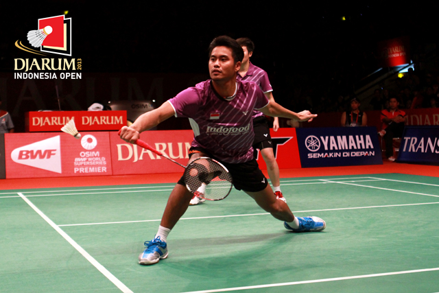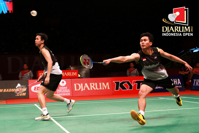 Mohammad Ahsan/Hendra Setiawan (Indonesia) mengembalikan shuttlecock ke arah pasangan asal Rusia, Vladimir Ivanov/Ivan Sozonov.