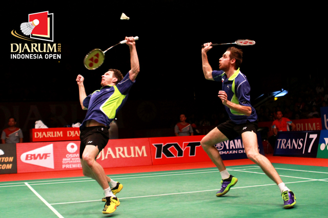Vladimir Ivanov/Ivan Sozonov (Rusia) berusaha menggapai pengembalian dari Mohammad Ahsan/Hendra Setiawan (Indonesia).