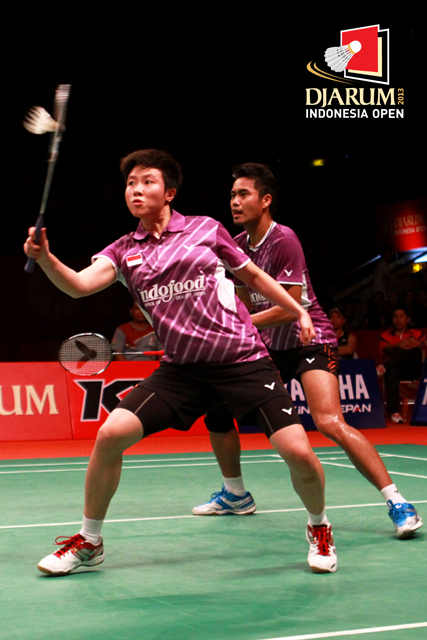 Tontowi Ahmad/Liliyana Natsir (Indonesia) berhasil menghadang serangan yang dilepaskan Joachim Fischer/Christinna Pedersen (Denmark).