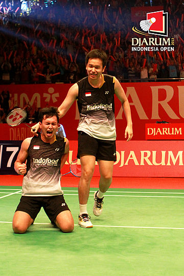 Ekspresi dan selebrasi Mohammad Ahsan/Hendra Setiawan (Indonesia) setelah berhasil memastikan diri sebagai juara usai mengalahkan Ko Sung Hyun/Lee Yong Dae (Korea Selatan) di final Djarum Indonesia Open Super Series Premier 2013.