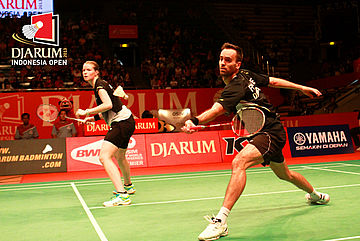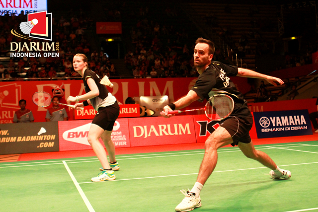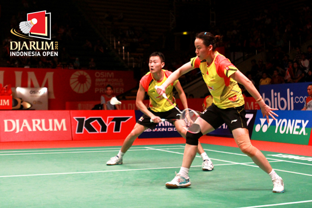 Joachim Fischer Nielsen/Christinna Pedersen (Denmark) mengembalikan shuttlecock ke arah Zhang Nan/Zhao Yunlei (China).