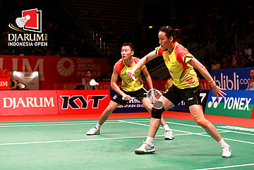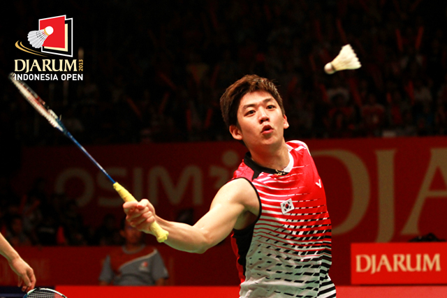 Lee Yong Dae (Korea Selatan) mengembalikan shuttlecock ke arah Mohammad Ahsan/Hendra Setiawan (Indonesia).