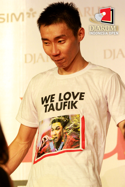 Lee Chong Wei (Malaysia) memamerkan kaos "We Love Taufik" saat menaiki podium juara sebagai bentuk apresiasinya kepada legenda bulutangkis Indonesia yang baru saja gantung raket itu.