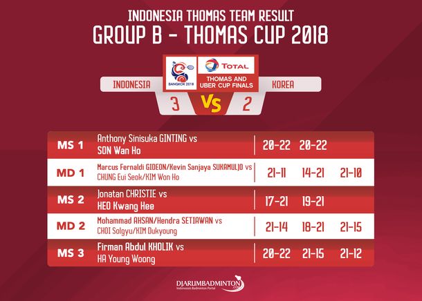 Berikut hasil lengkap pertandingan tim Thomas Indonesia melawan Korea: