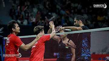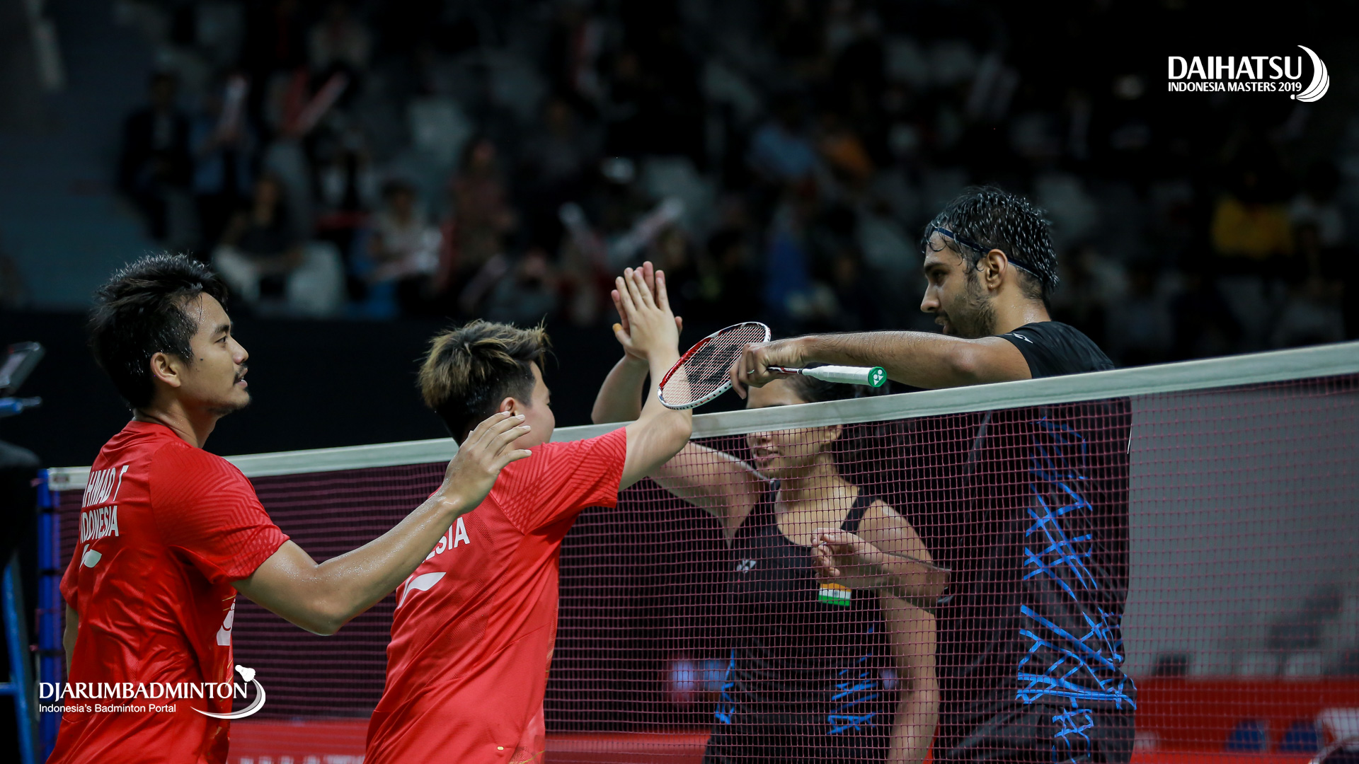 Pranaav Jerry CHOPRA/REDDY N. Sikki (India) dan Tontowi AHMAD/Liliyana NATSIR (Indonesia) bersalaman seusai pertandingan