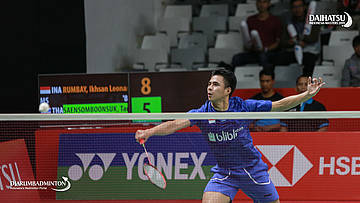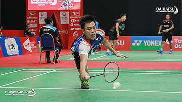 Ikhsan Leonardo Imanuel RUMBAY (Indonesia) berusaha mengembalikan shuttlecock
