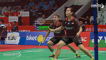 Rehan Naufal KUSHARJANTO/Siti Fadia Silva RAMADHANTI (Indonesia) bersiap menerima serangan