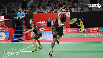 Rehan Naufal KUSHARJANTO/Siti Fadia Silva RAMADHANTI (Indonesia) menyambar pengembalian
