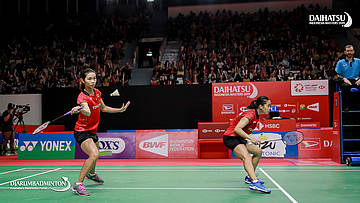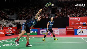 Greysia POLII/Apriyani RAHAYU (Indonesia) menyambut serangan