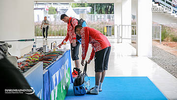Fajar ALFIAN/Muhammad Rian ARDIANTO (Indonesia) menyerahkan raket yang putus untuk diperbaiki