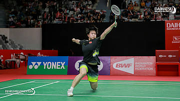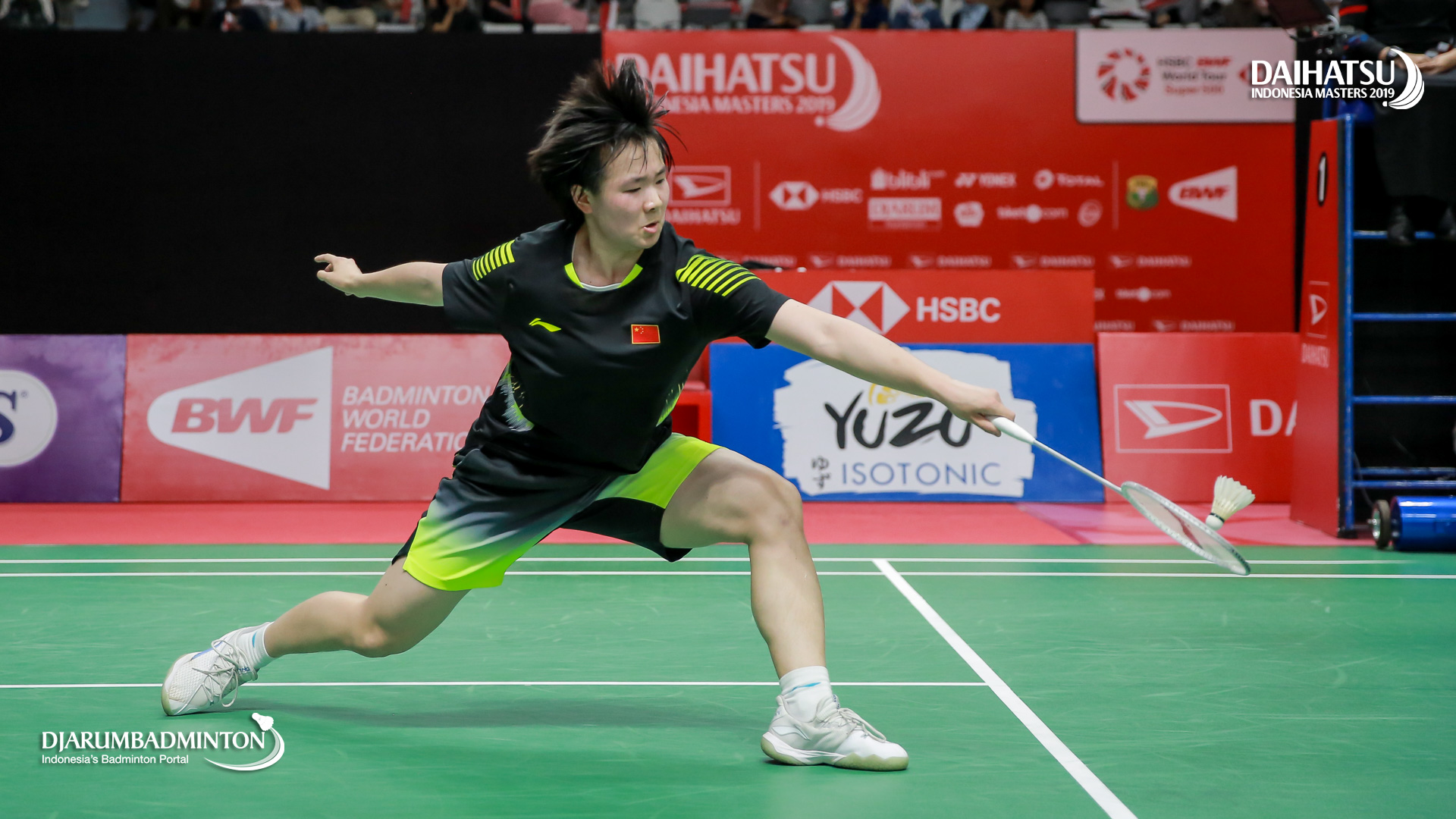 CHEN Yufei (Tiongkok) berusaha menggapai pengembalian