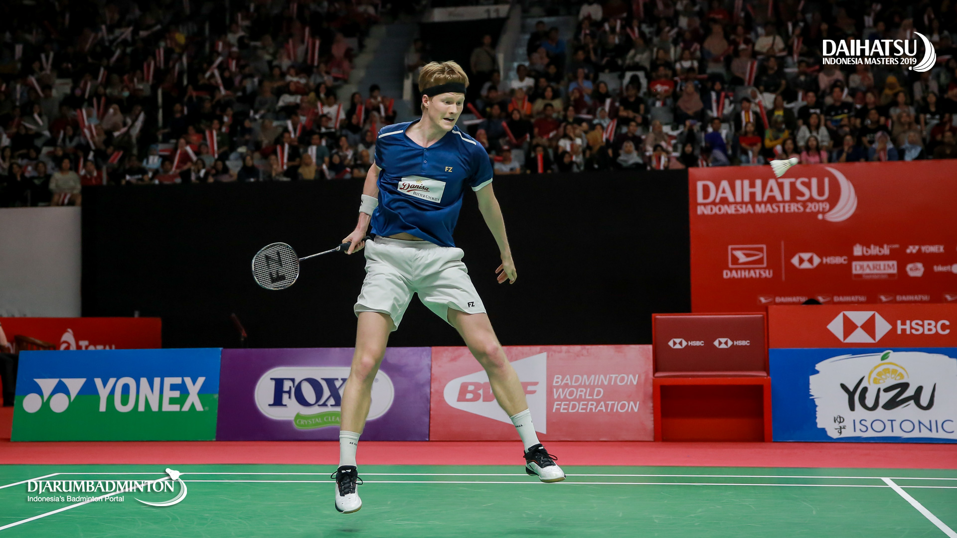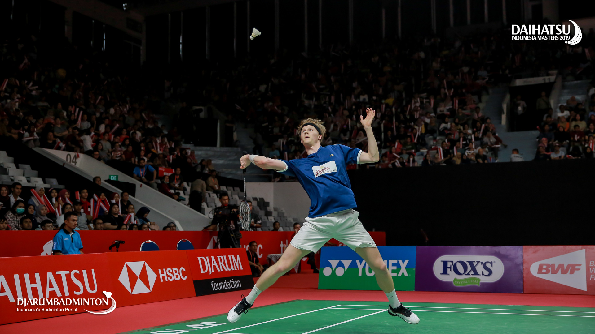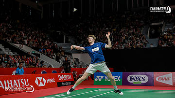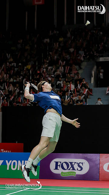 Anders ANTONSEN (Denmark) berusaha mengembalikan shuttlecock