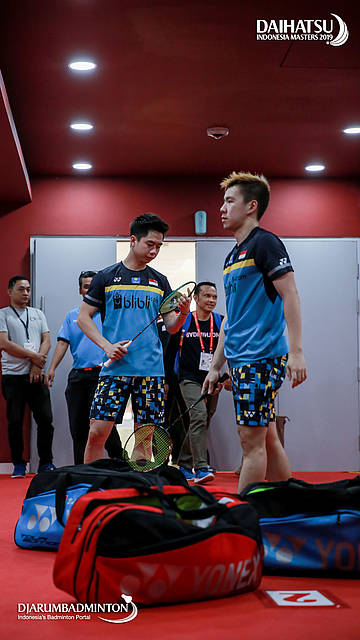 Marcus Fernaldi GIDEON/Kevin Sanjaya SUKAMULJO (Indonesia) bersiap sebelum memasuki arena pertandingan