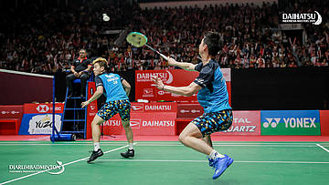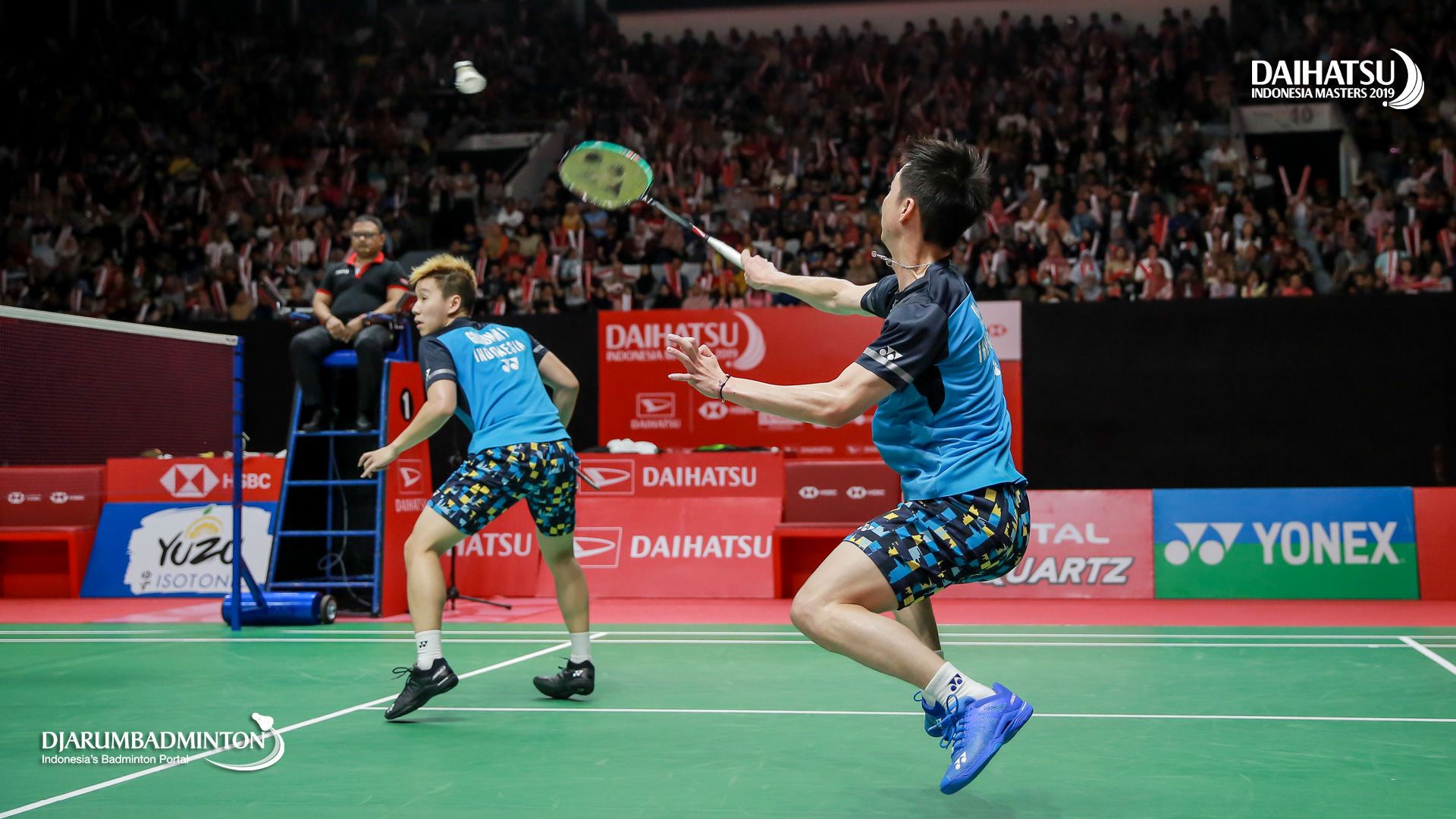 Marcus Fernaldi GIDEON/Kevin Sanjaya SUKAMULJO (Indonesia) bersiap melepaskan serangan