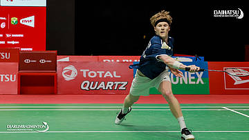 Anders Antonsen (Denmark) bersiap mengembalikan serangan