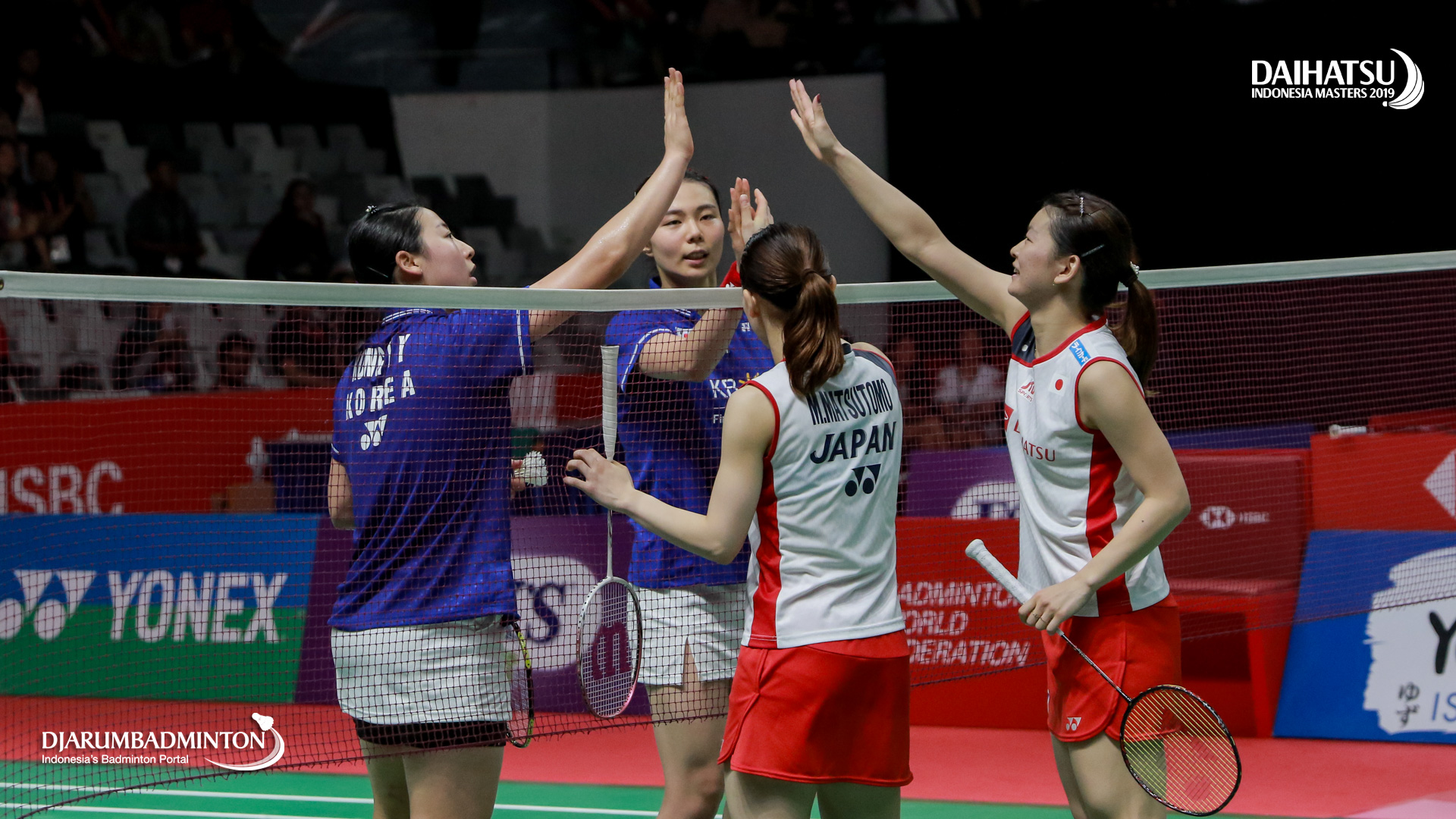 Misaki Matsutomo/Ayaka Takahashi (Japan) dan Kim So Yeong/Kong Hee Yong (Korea) bersalaman usai bertanding