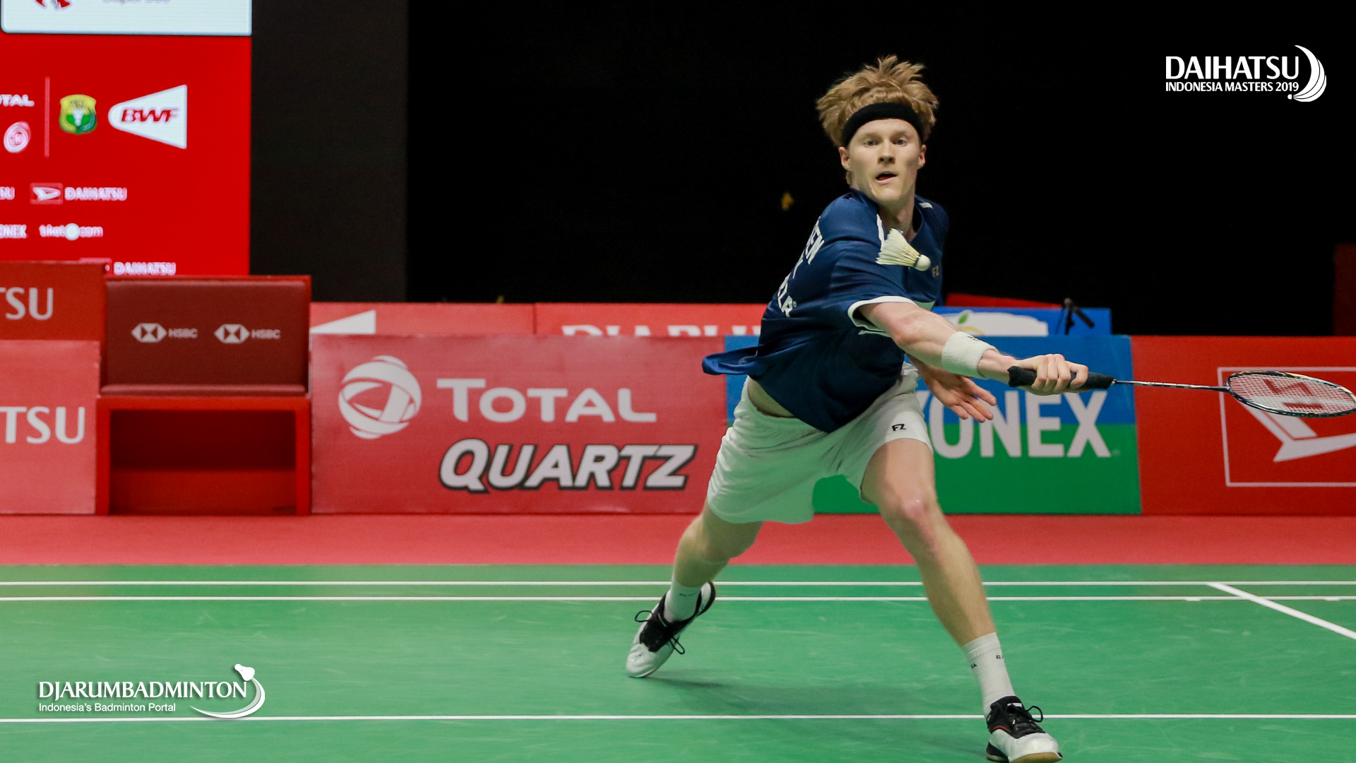 Anders Antonsen (Denmark) bersiap menyambut serangan