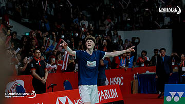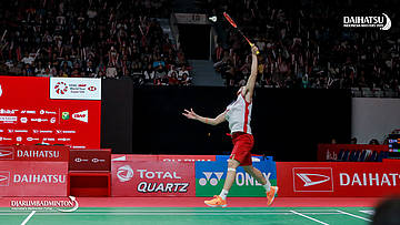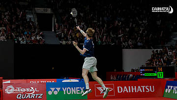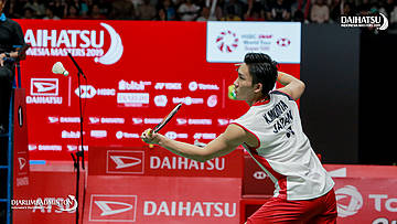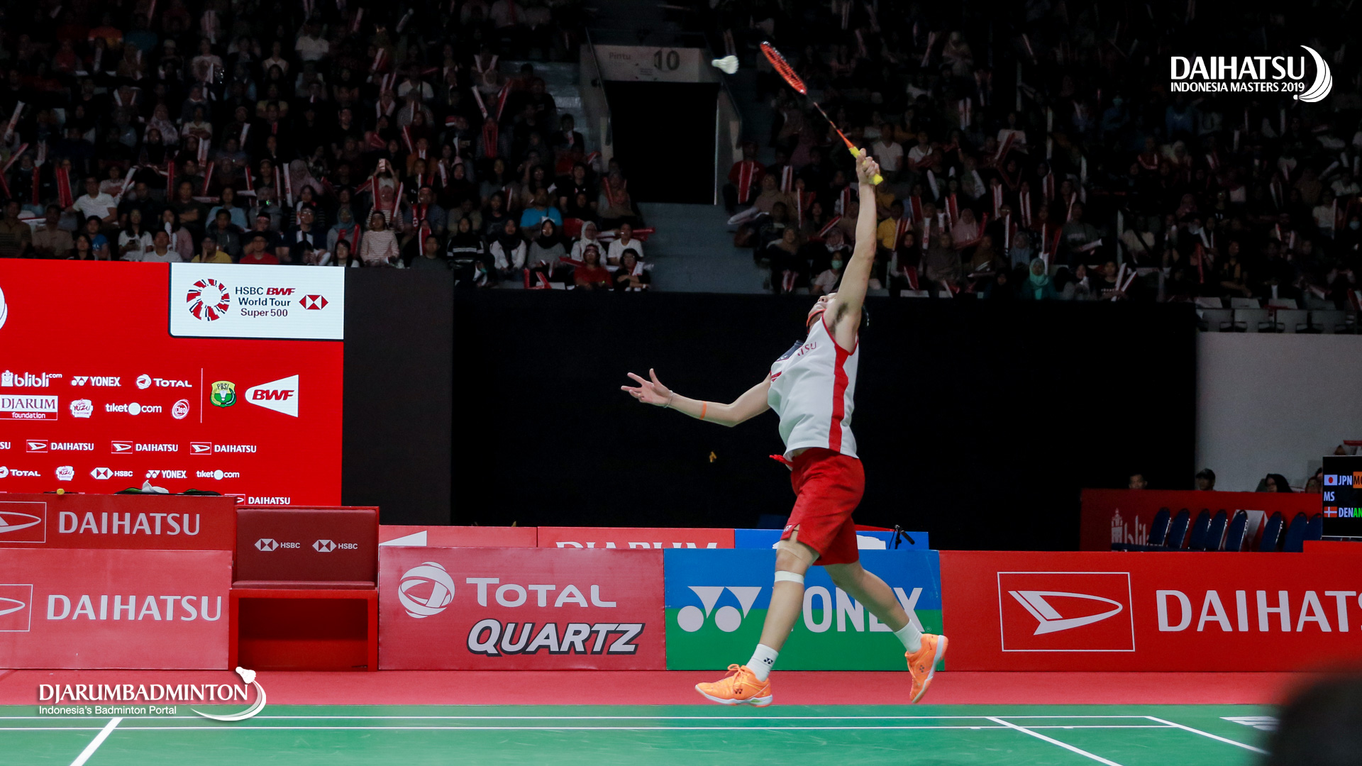 Kento Momota (Japan) berusaha mengembalikan serangan