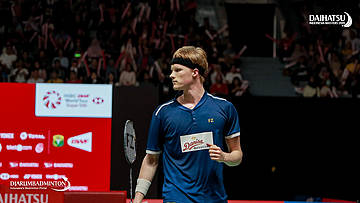 Anders Antonsen (Denmark) bersiap melepaskan serangan