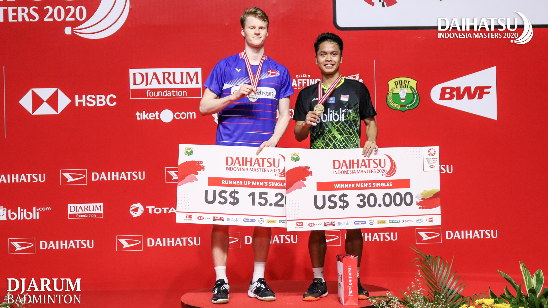 Podium Runner Up Anders ANTONSEN (Denmark) dan Anthony Sinisuka GINTING (Indonesia) Juara Tunggal Putri Daihatsu Indonesia Masters 2020