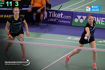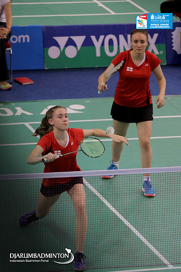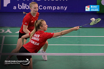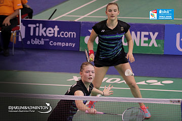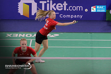 Amalie Magelund/Freja Ravn (Denmark) Berusaha Menggapai Shuttlecock