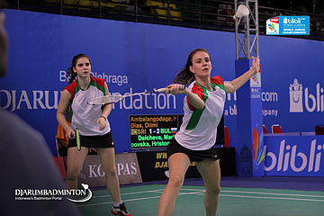 Maria Delcheva/Hristomira Popovska (Bulgaria) Mengembalikan Shuttlecock
