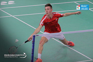 Arnaud Merkle (France) Berusaha Menggapai Shuttlecock