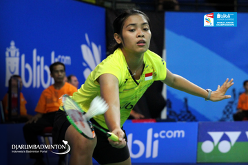Gregoria Mariska Tunjung (Indonesia) Berusaha Menggapai Shuttlecock