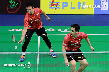 Hendra Setiawan/Mohammad Ahsan (DKI Jakarta/Jawa Tengah) Mengembalikan Shuttlecock