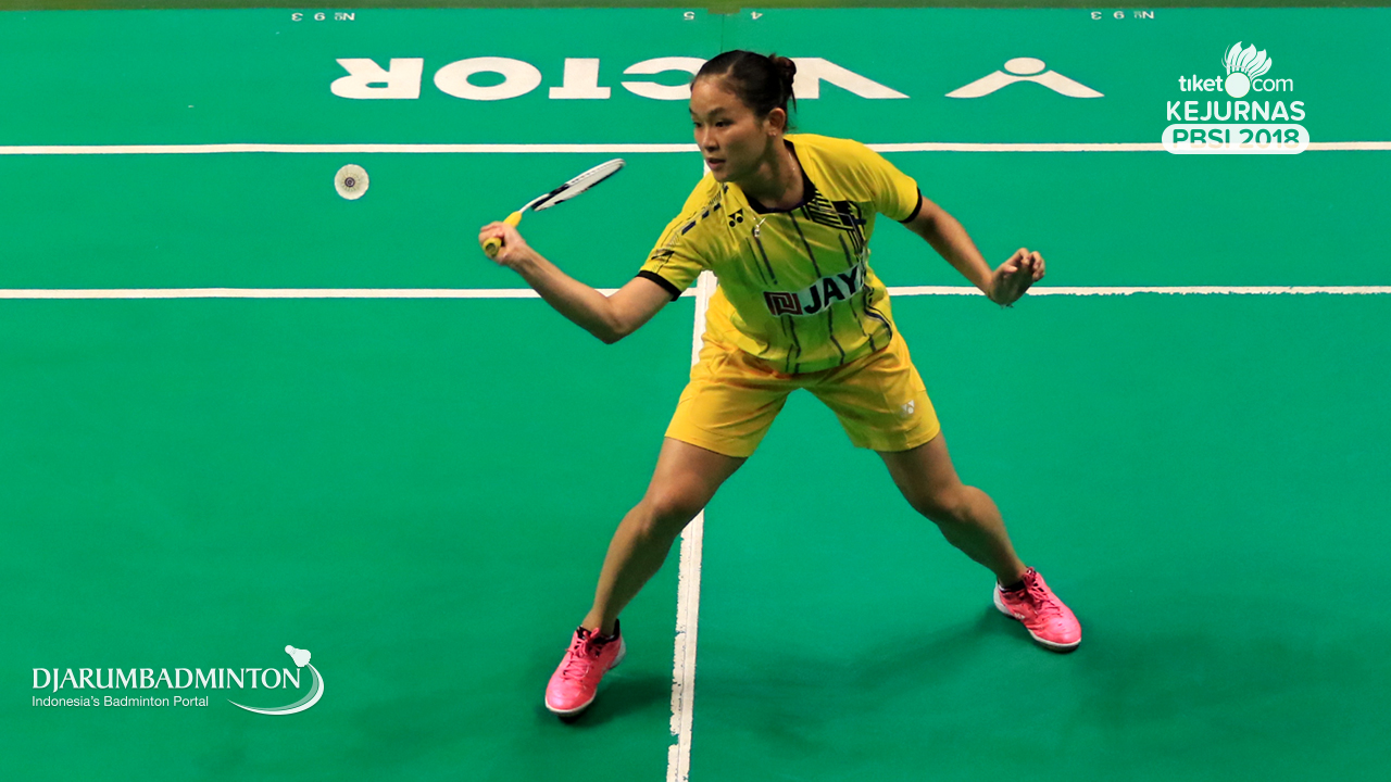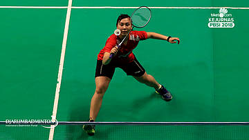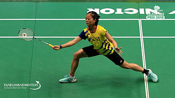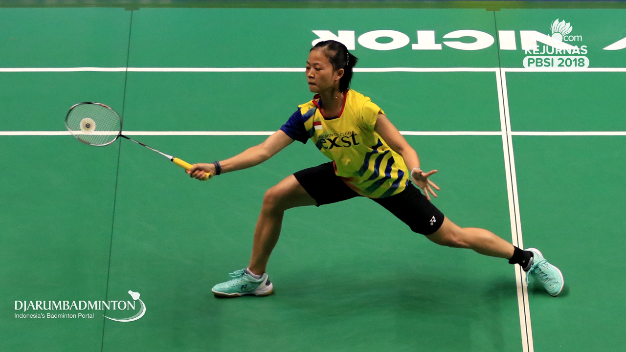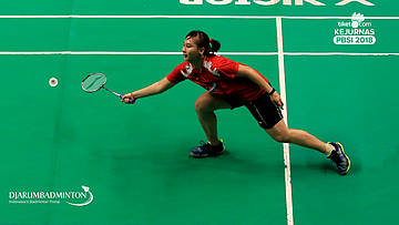 Fitriani (Exist Jakarta) Berusaha menggapai shuttlecock
