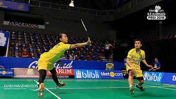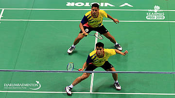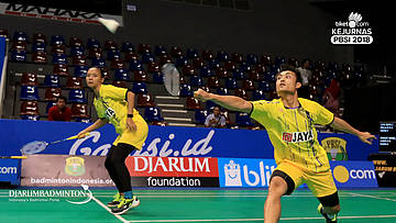 Frengky Wijaya Putra+Sabar Karyaman Gutama (Exist Jakarta) Bersiap mengembalikan shuttlecock