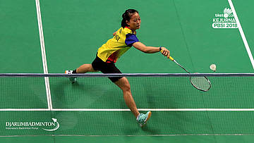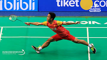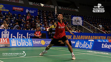 Anthony Sinisuka Ginting (SGS PLN Bandung) Menyambar pengembalian lawan
