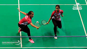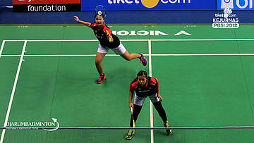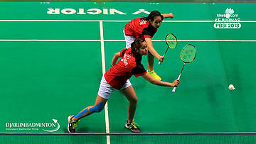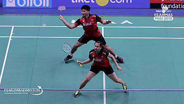 Melati Daeva Oktaviani+Praveen Jordan (PB Djarum Kudus) Mengembalikan shuttlecock