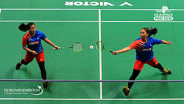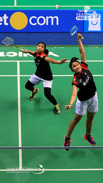 Muzammil Elya Tantri+Sang Ayu Putu Kharisma Maharani (Jawa Tengah) Berusaha menggapai shuttlecock.