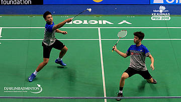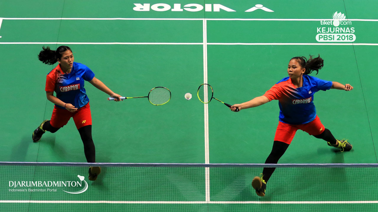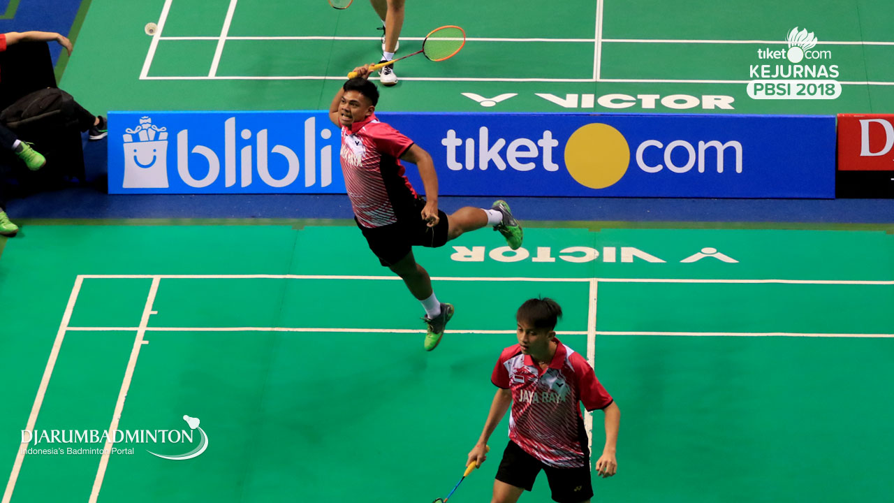 Rahmad Julio Rafli Ritonga+Rexky Afdillah (DKI Jakarta) mengembalikan shuttlecock