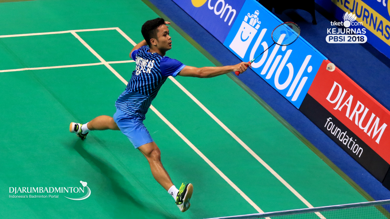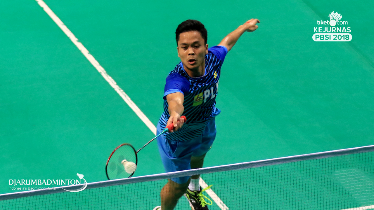 Anthony Sinisuka Ginting (SGS PLN Bandung) menyambar pengembalian lawan