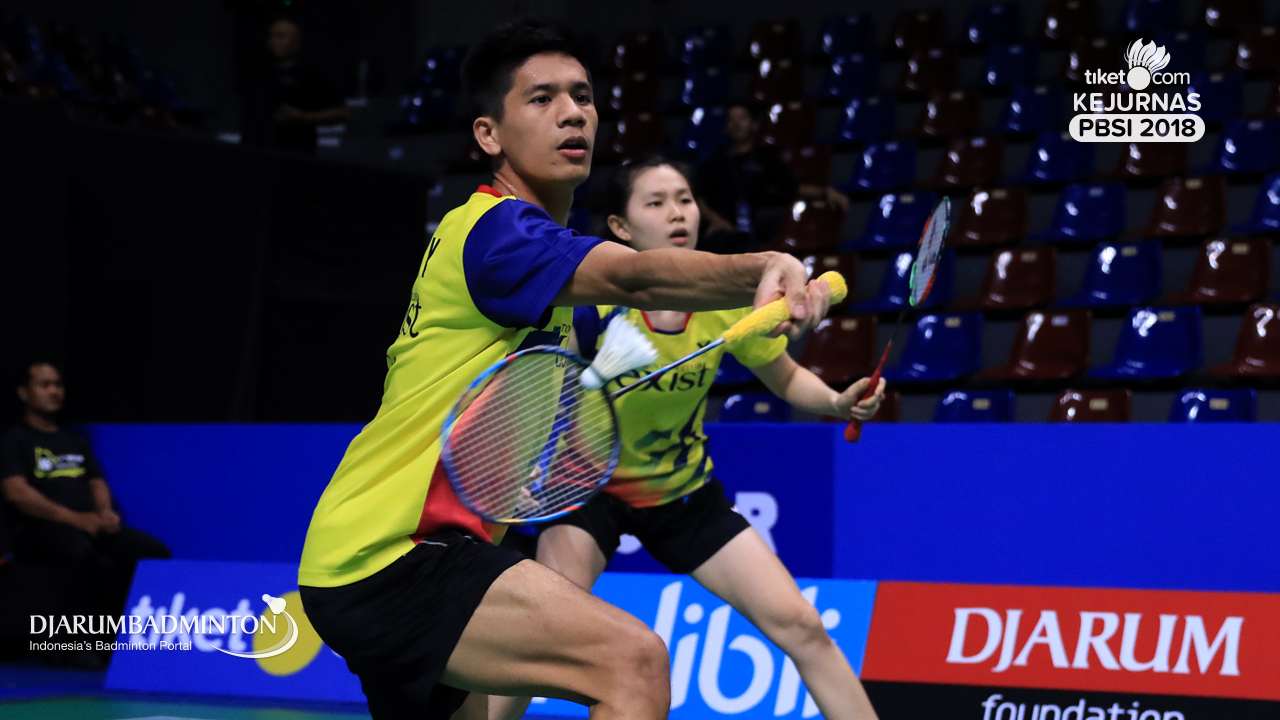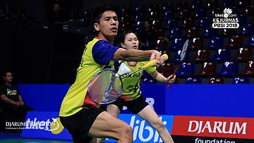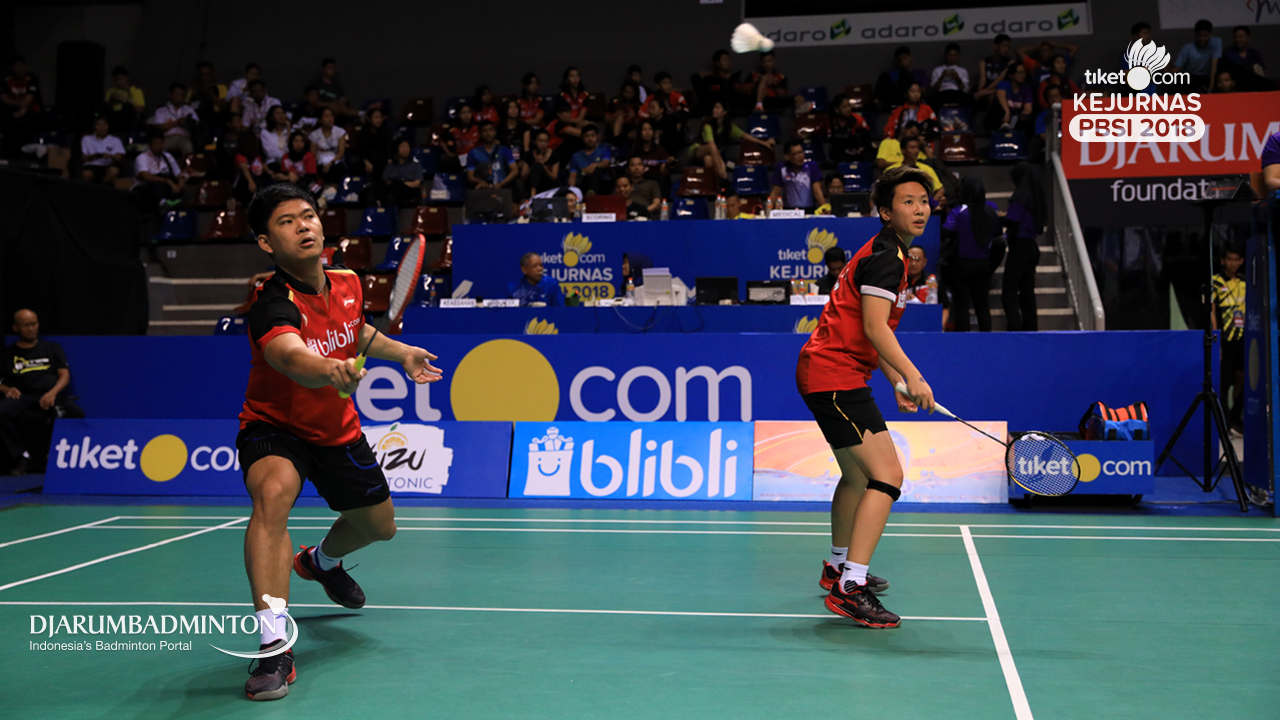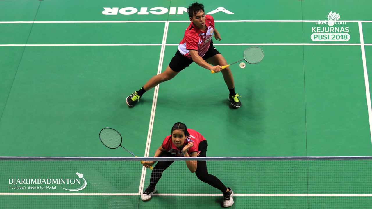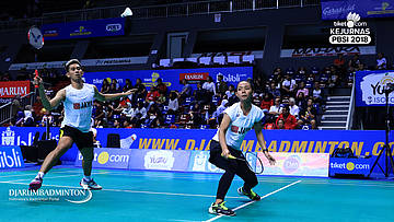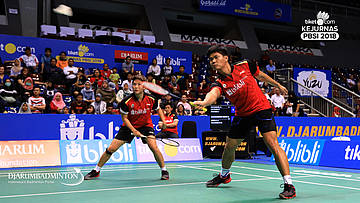 Alfian Eko Prasetya+Della Destiara Haris (Jaya Raya Jakarta) Mengembalikan shuttlecock