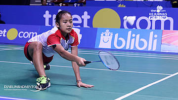 Apriyani Rahayu+Della Destiara Haris (Jaya Raya Jakarta) Mengembalikan shuttlecock