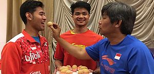KUNSHAN - Pebulutangkis ganda putra Indonesia Angga Pratama merayakan hari ulang tahunnya yang ke-25 di tengah-tengah mengikuti turnamen Piala Thomas...