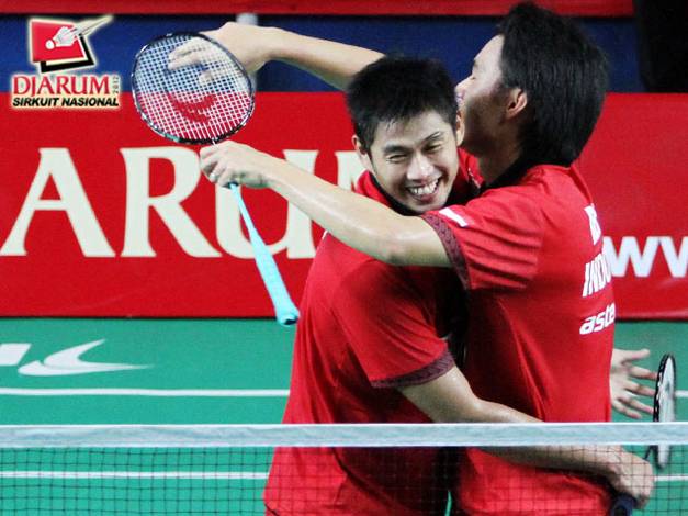 Rendra/Rian mengalahkan pasangan Djarum Kudus Darmiko/Wifqi Windarto dalam tiga set, 21-15, 14-21, 21-12 di GOR Asia Afrika, Senayan, Jakarta, Sabtu (18/5). Meski sering bertemu, perlawanan kedua pasangan begitu alot dan ketat.