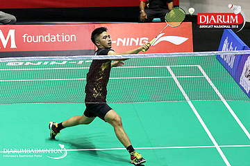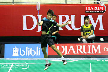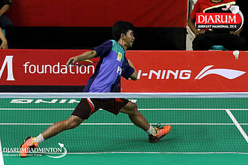 Arief Prakoso (PB AIC Badminton Academy) mengembalikan serangan