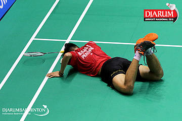 Satria Maulana Rahmadi Lubis (Pratama Badminton Academy, Sby) terjatuh saat berusaha mengembalikan serangan