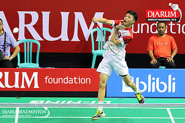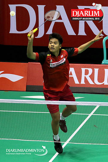 Syabda Perkasa Belawa (PB Djarum, Kudus) bersiap menyambar pengembalian